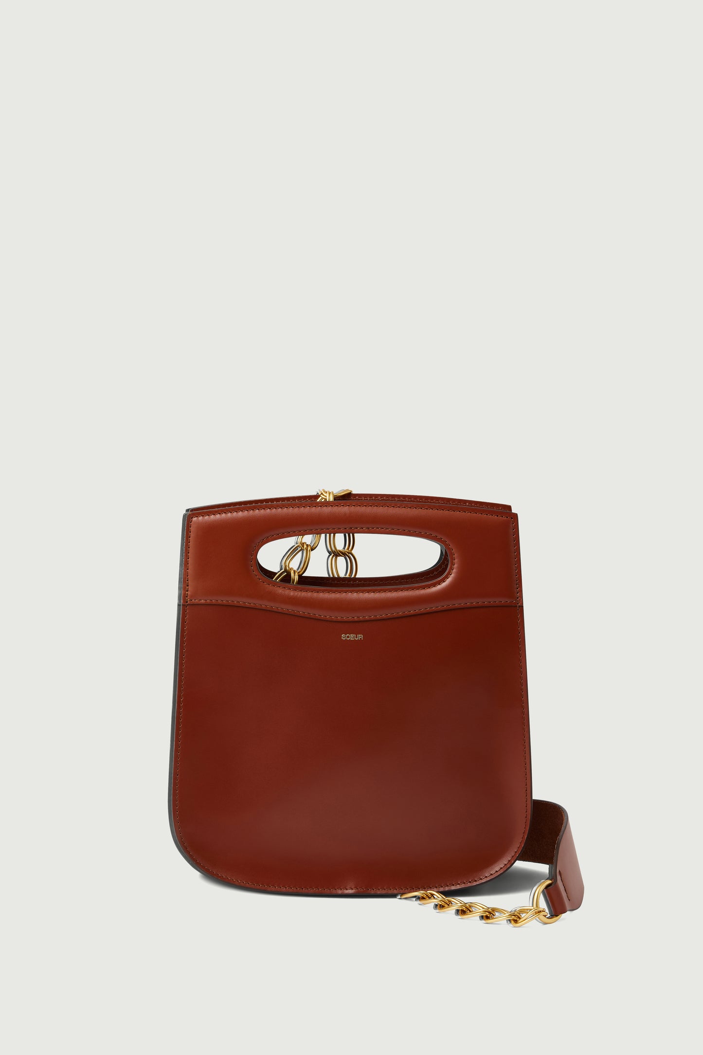 - Removable gold chain and leather handle
