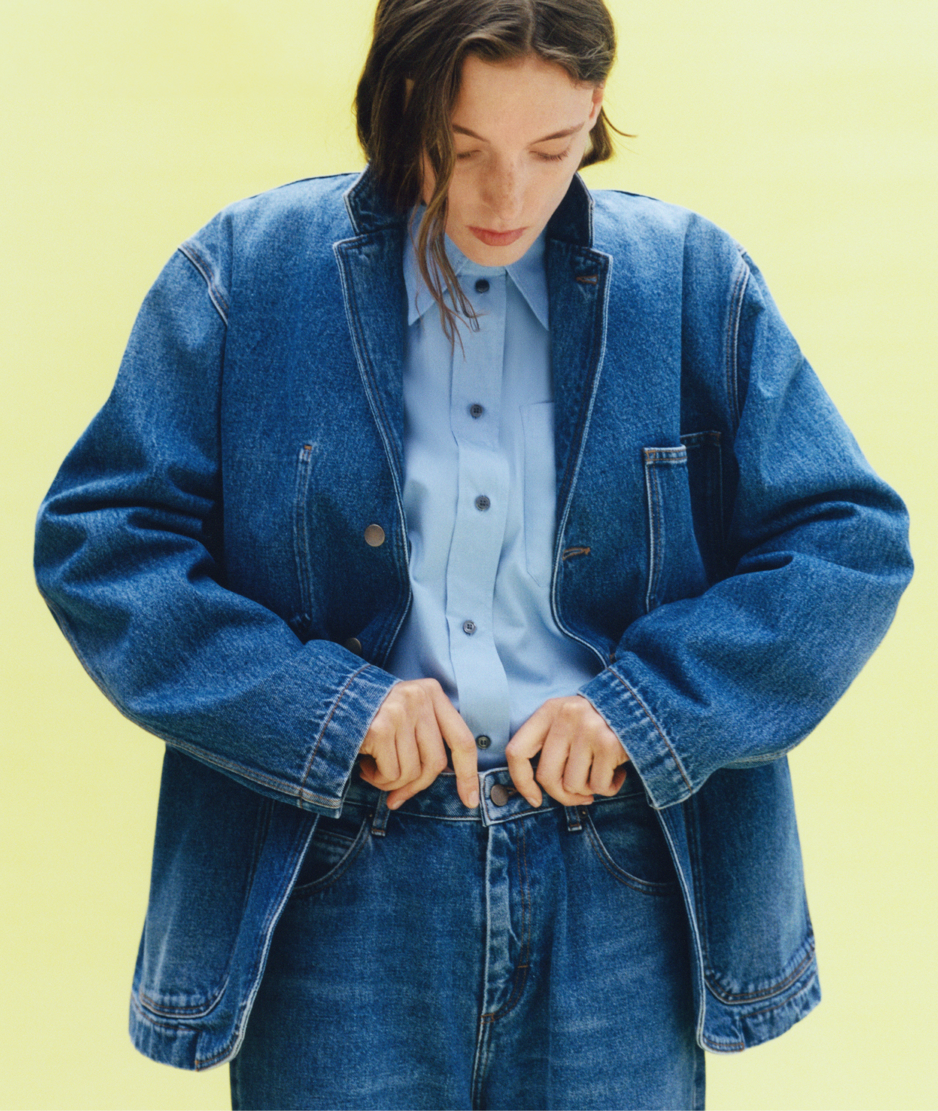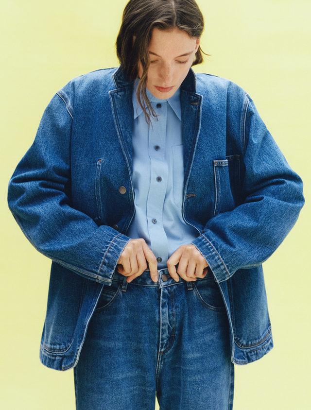 Il denim, punto fermo della collezione Soeur, viene proposto in un lavaggio classico ma con un nuovo look, come una giacca da abito, elegante e morbida.
