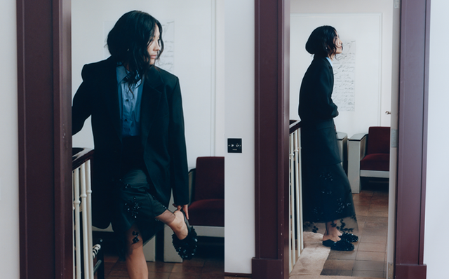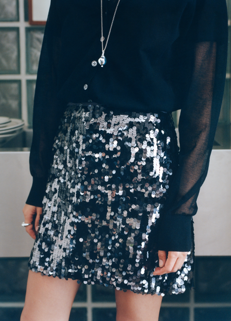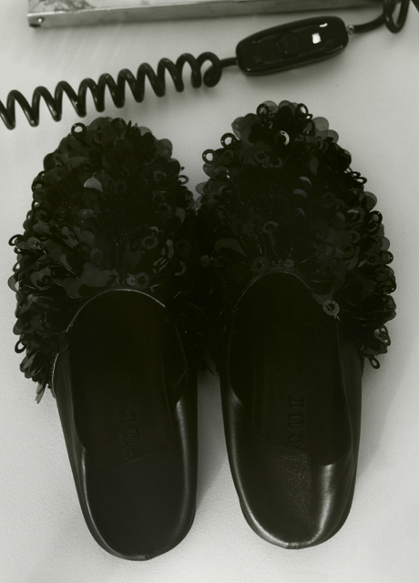 La trasparenza di una gonna di tulle ricamata, la fantasia di una minigonna e ballerine piatte con paillettes,