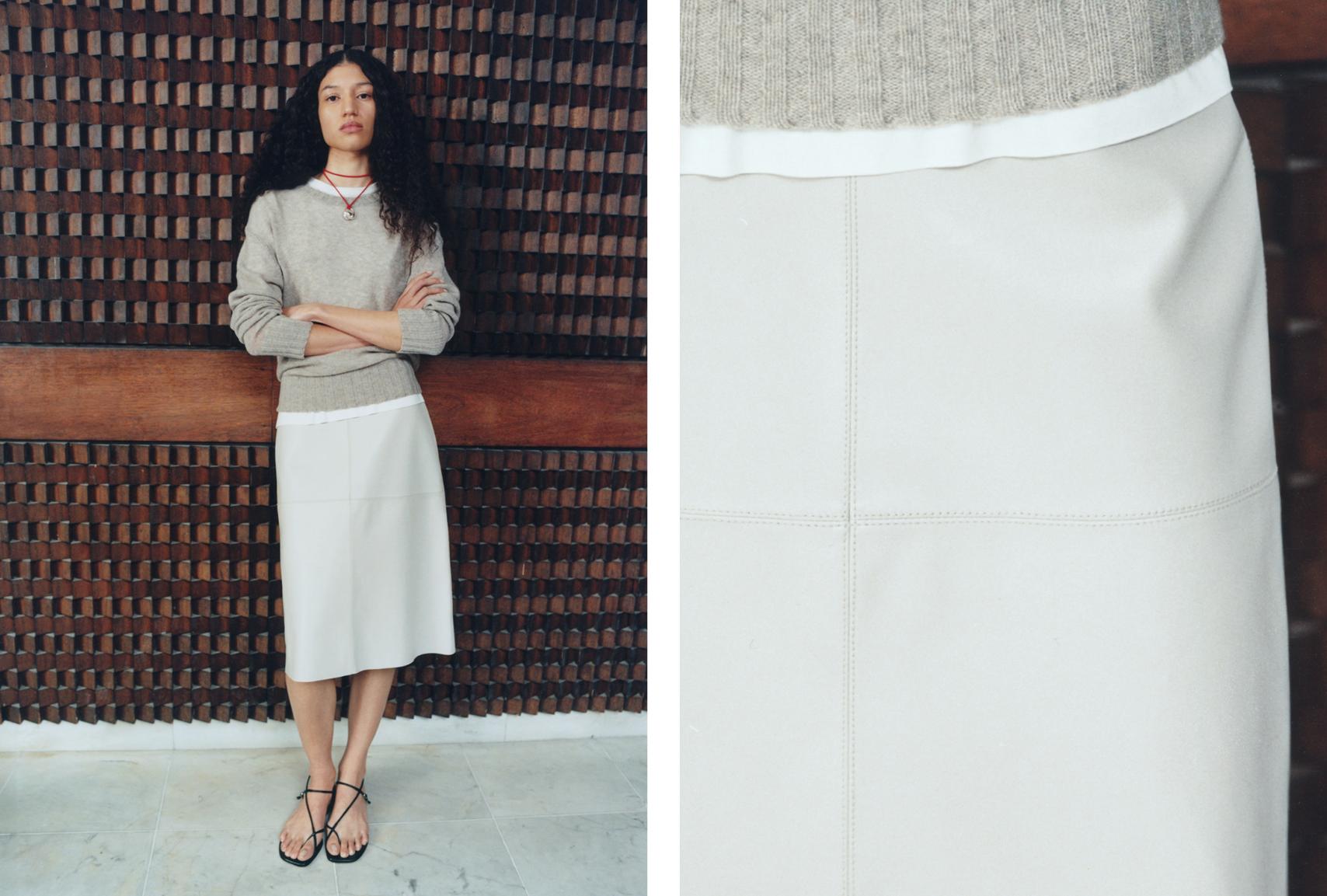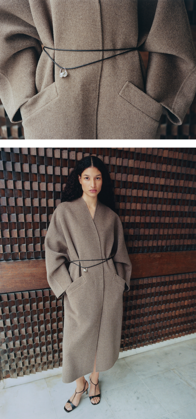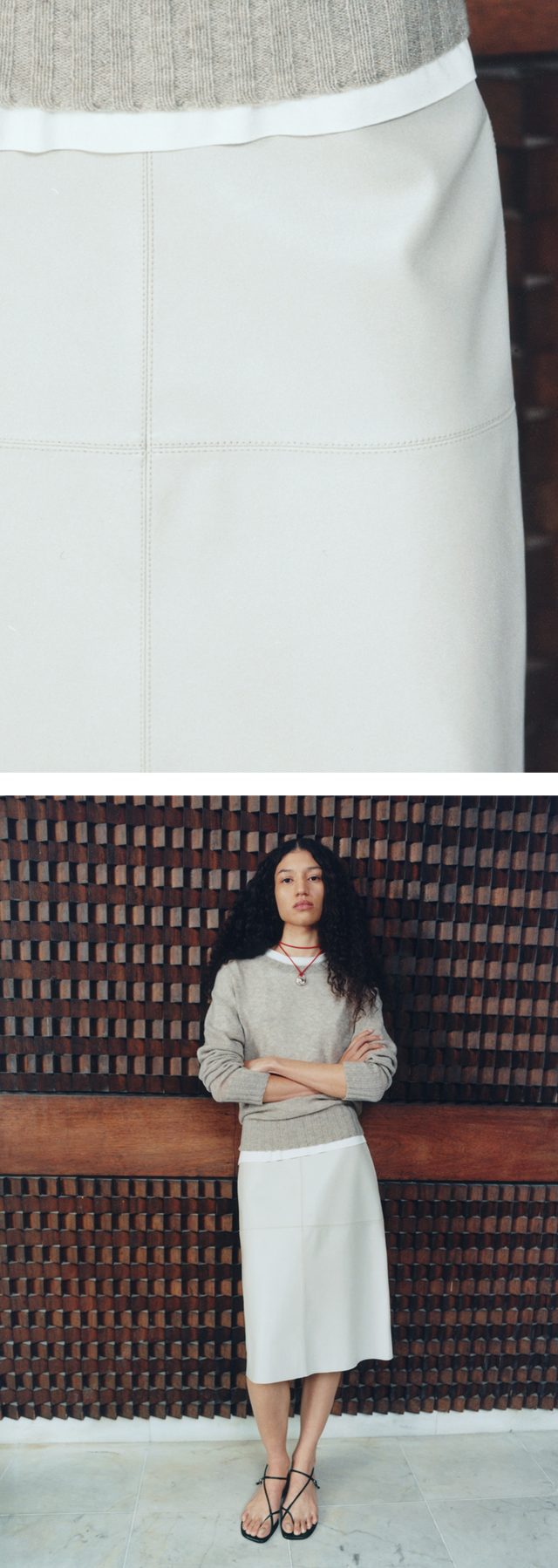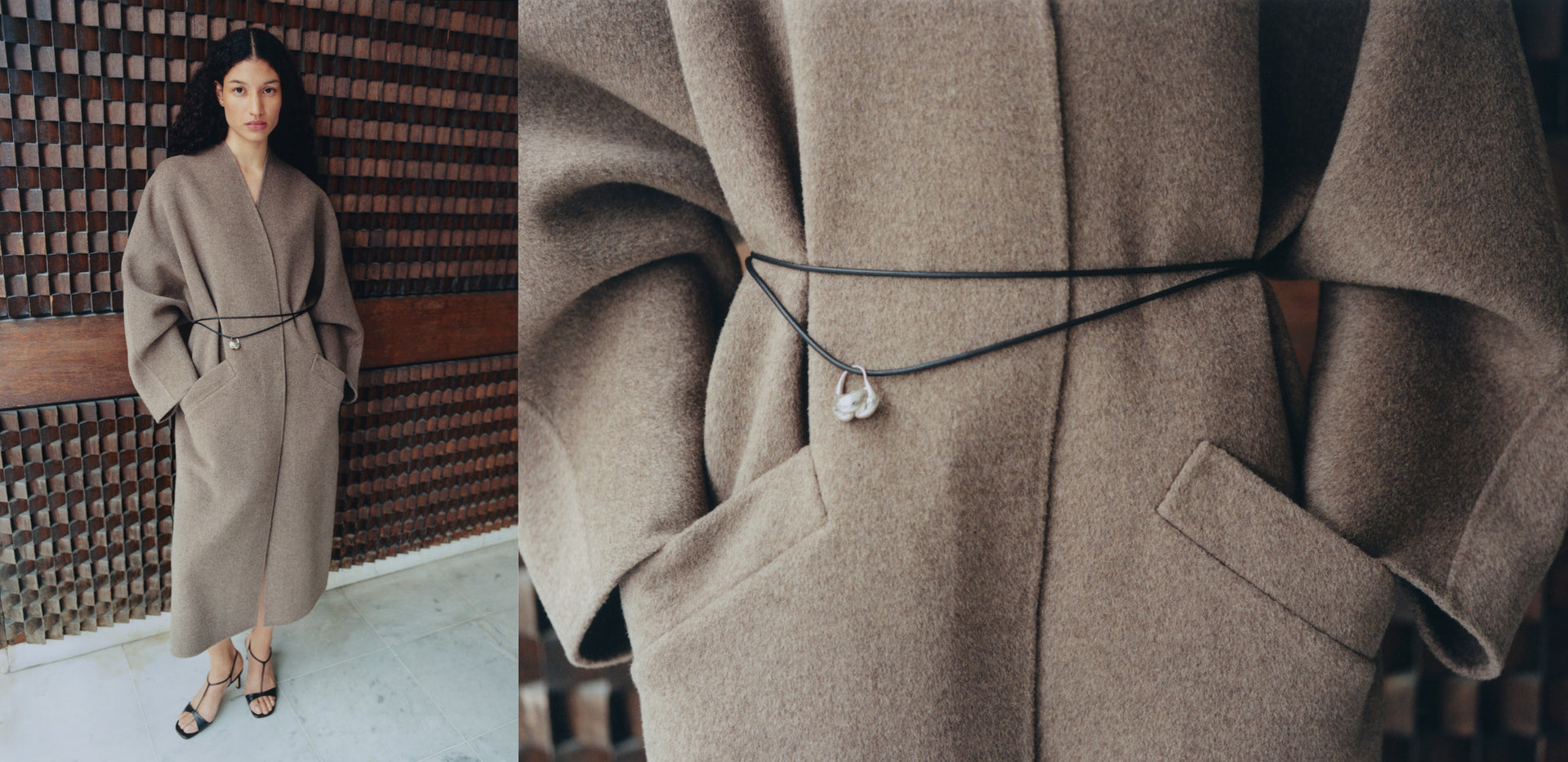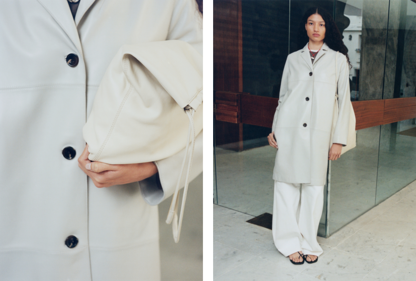 Una palette di sfumature di bianco, beige e gesso disegna un guardaroba urbano e femminile. I materiali si sovrappongono e si mescolano con sensibile eleganza: lana double face melange, pelle morbida, popeline o denim testurizzato.