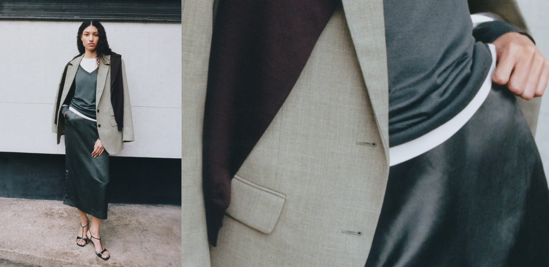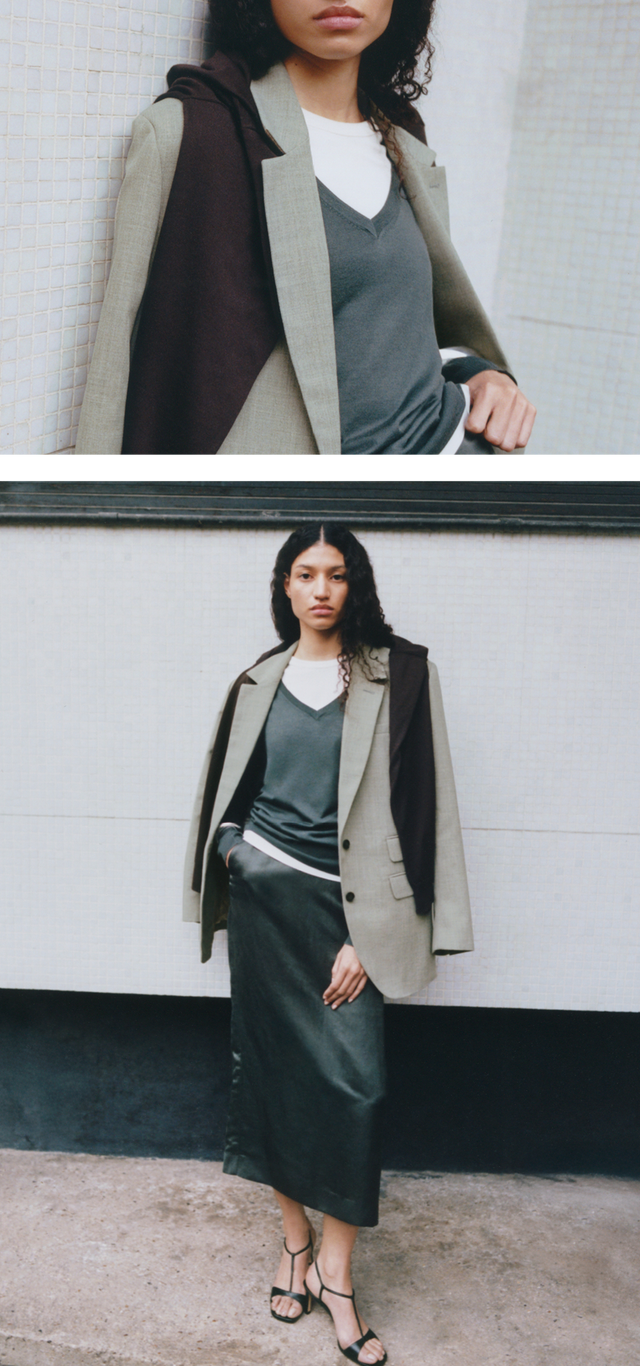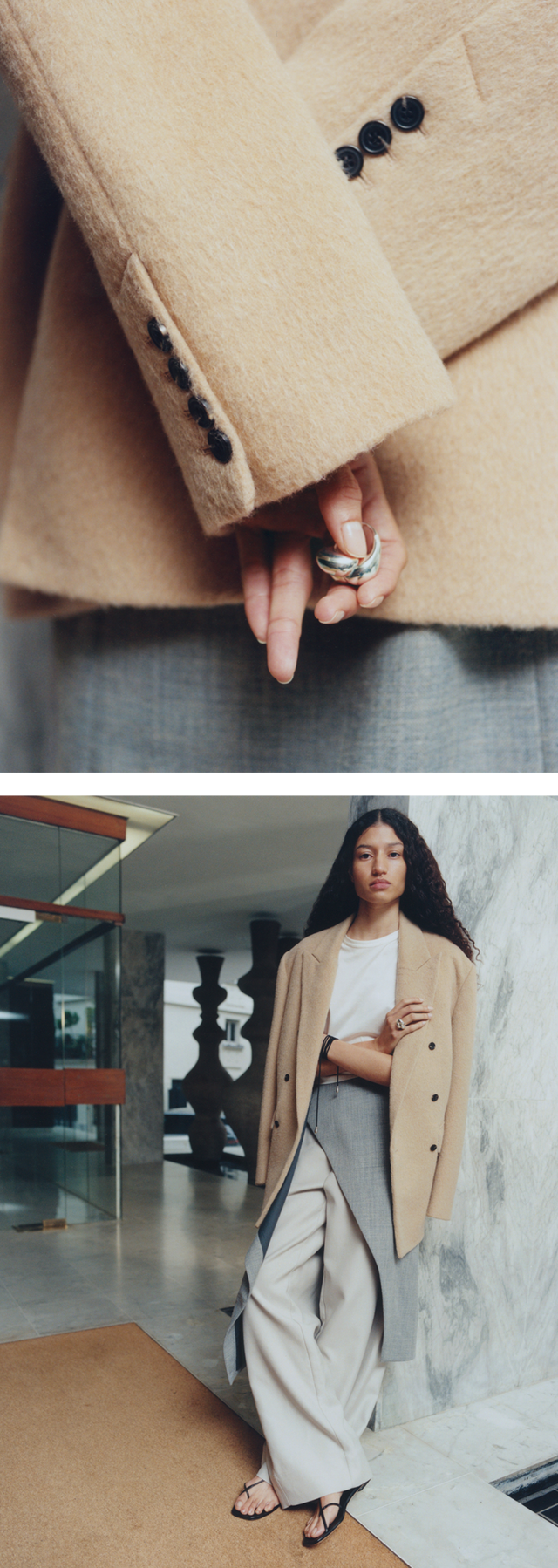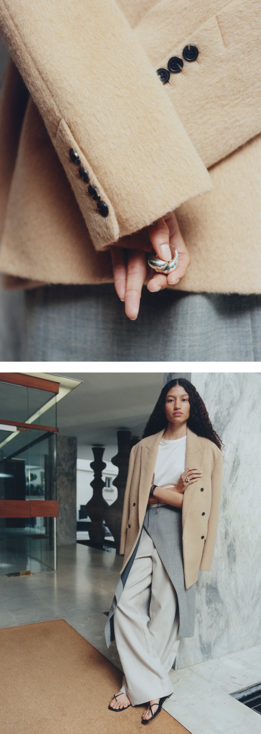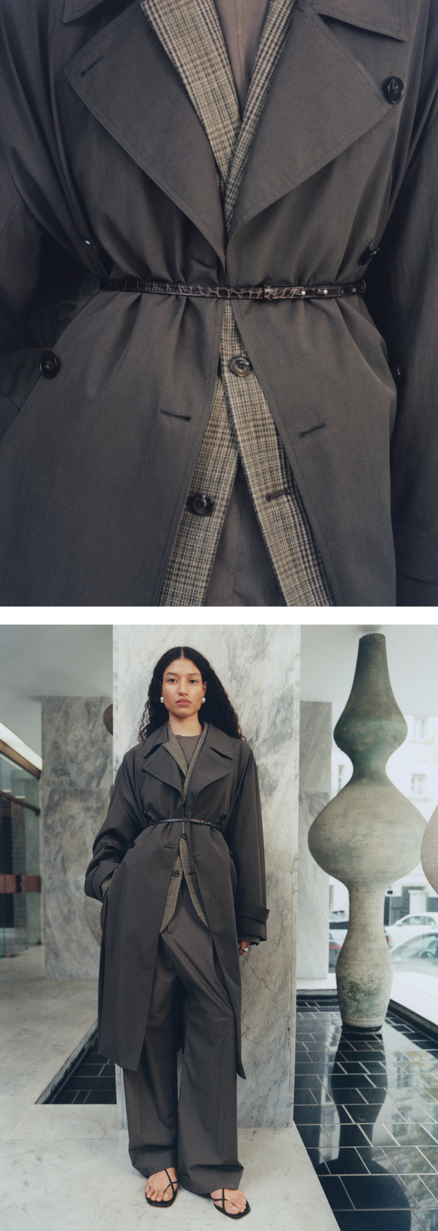 Una palette di sfumature di bianco, beige e gesso disegna un guardaroba urbano e femminile. I materiali si sovrappongono e si mescolano con sensibile eleganza: lana double face melange, pelle morbida, popeline o denim testurizzato.