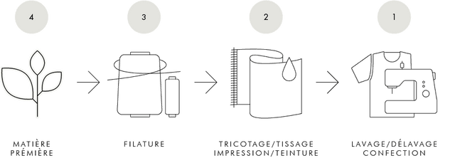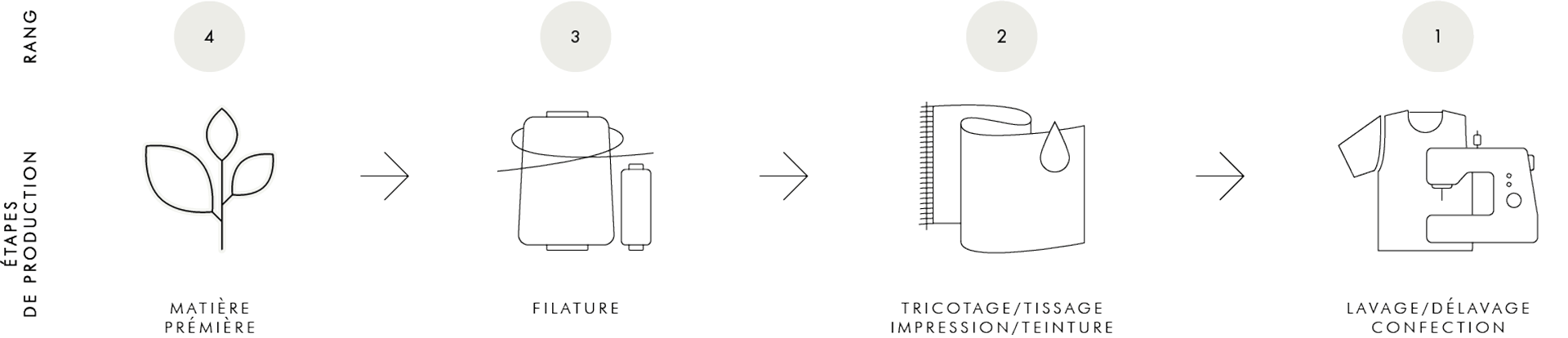 La filiera produttiva di un capo di abbigliamento si compone di 4 fasi principali: produzione ed estrazione delle materie prime, trasformazione delle materie prime (filatura), tessitura, lavorazione a maglia, tintura o stampa e, infine, produzione. In quanto marchio, siamo in contatto diretto con i fornitori di abbigliamento (livello 1) e talvolta con i fornitori di materiali (livello 2).