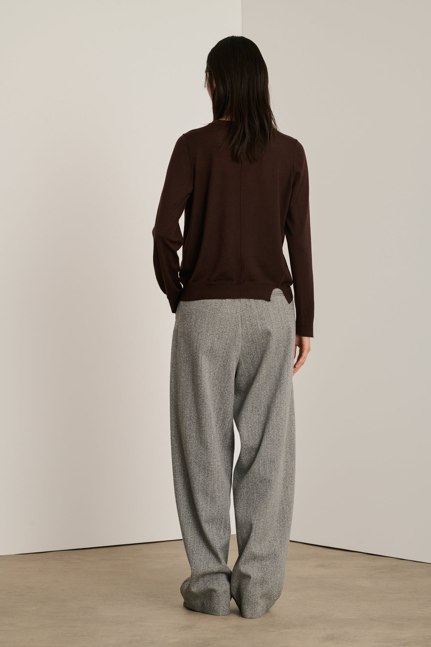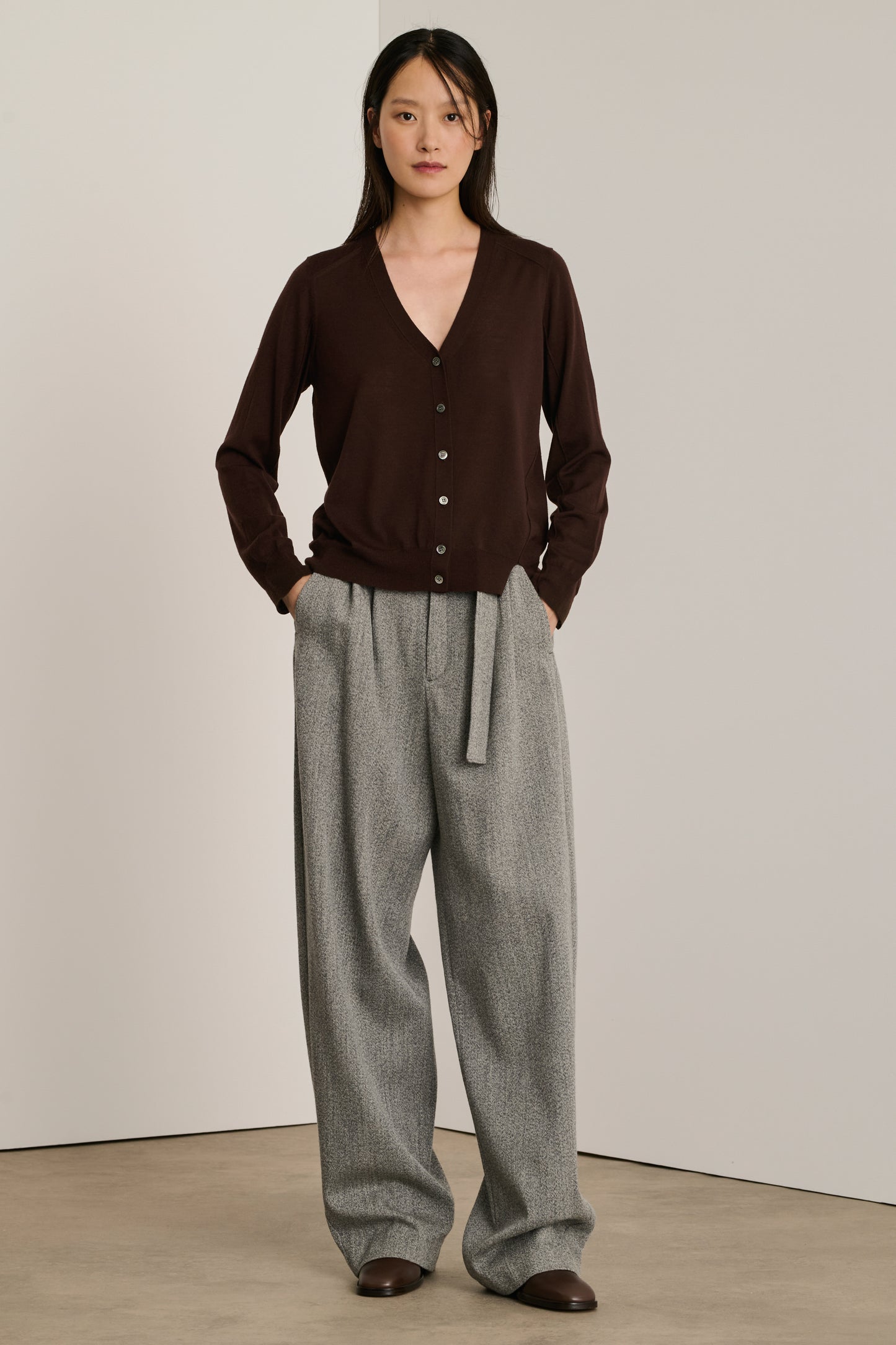 ALYSSA è un cardigan ampio con un'ampia scollatura a V. È lavorato a maglia in lana merino extra-fine da indossare direttamente sulla pelle. Asimmetria sul fondo, riduzioni, finiture a coste e cuciture rovesciate sono dettagli che arricchiscono questo cardigan apparentemente classico.