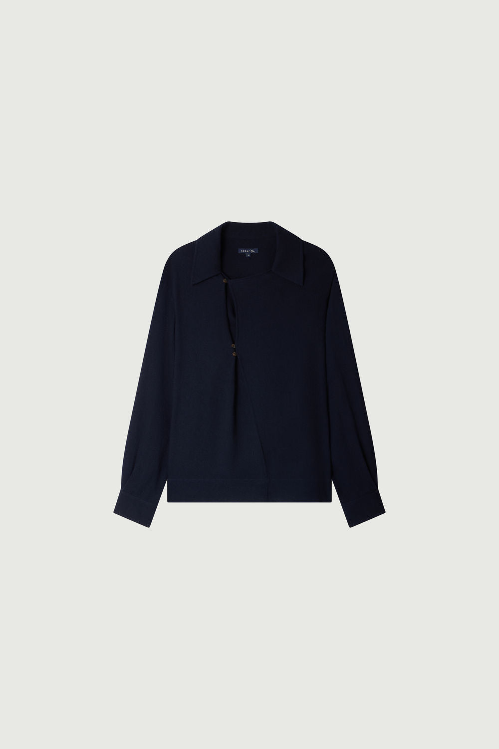 - Maniche lunghe con polsini da camicia abbottonati- Scollatura generosa con colletto lavorato e inserto abbottonato
