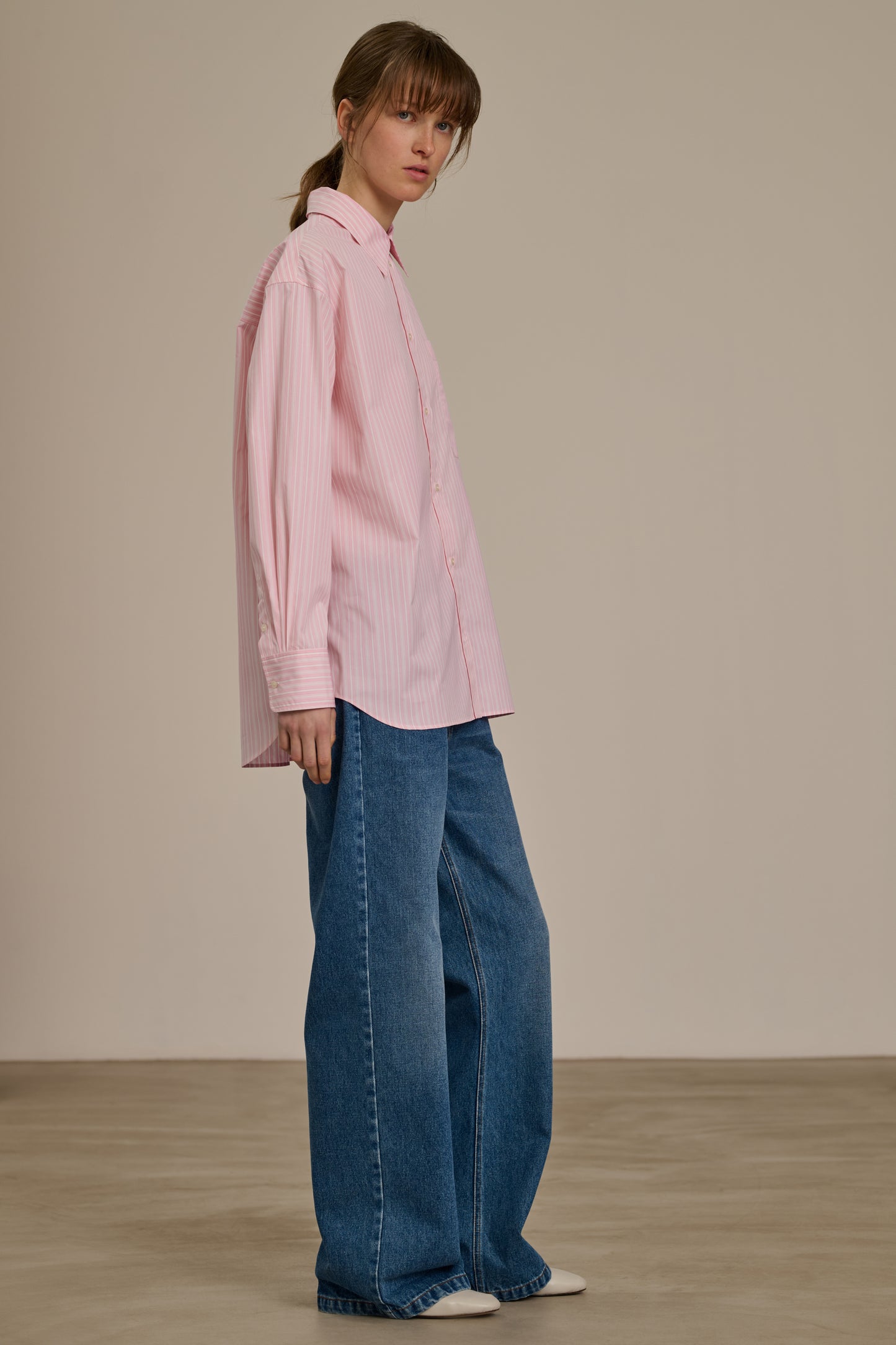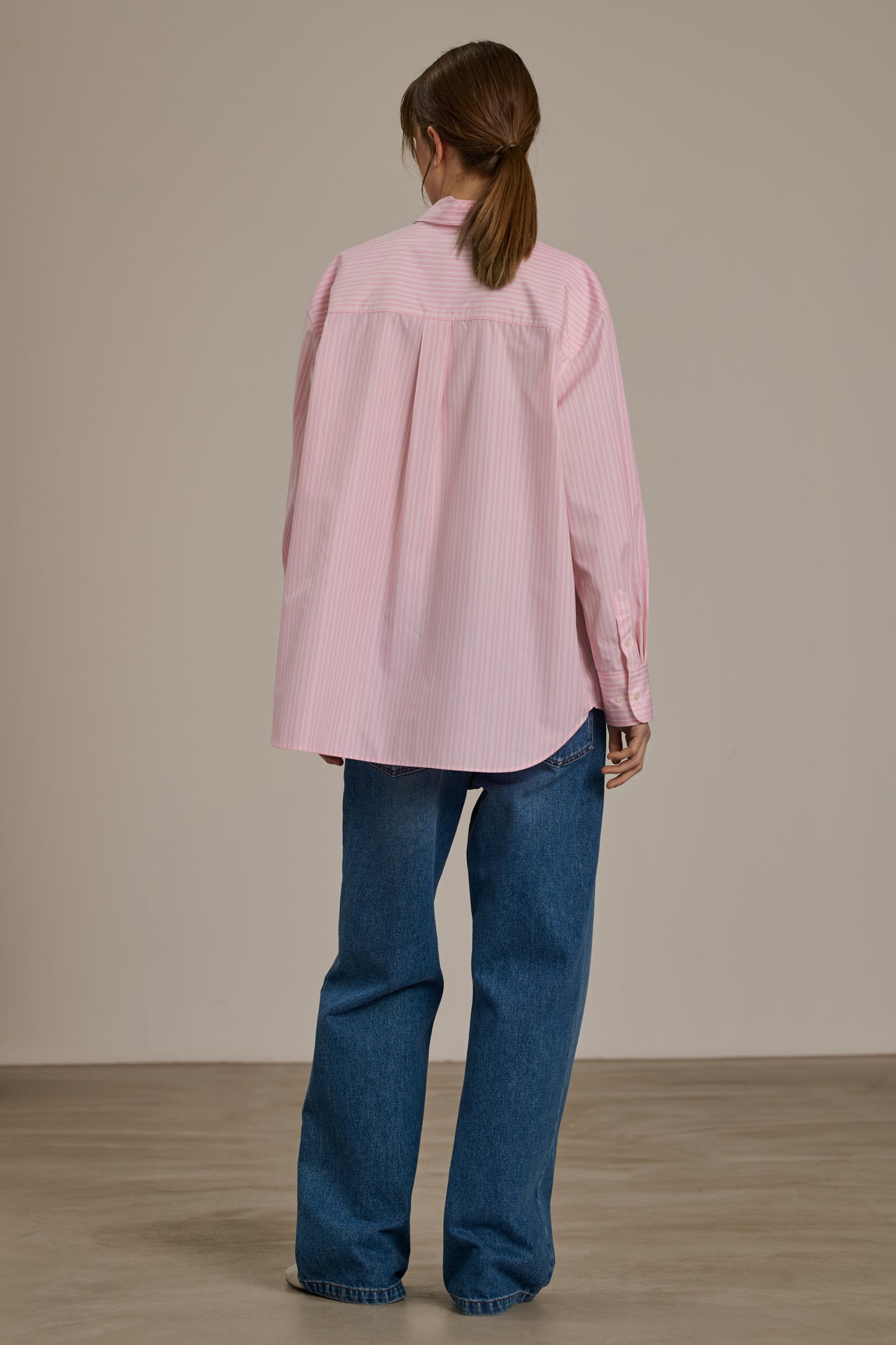 CARLOTTA è una camicia in popeline a righe che gioca con una vestibilità oversize ispirata al guardaroba maschile, per uno stile elegante e disinvolto.