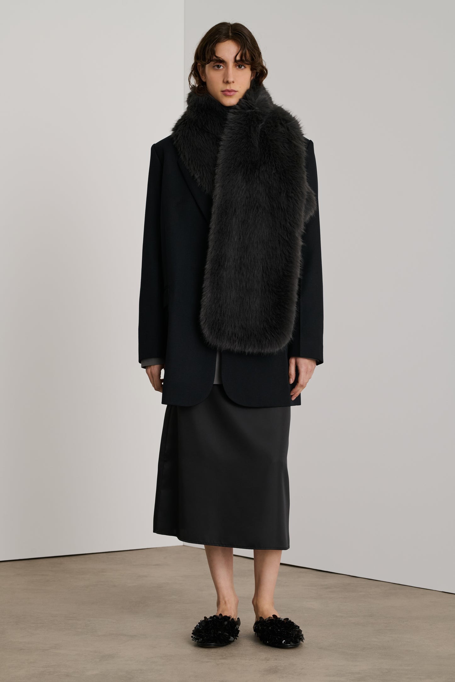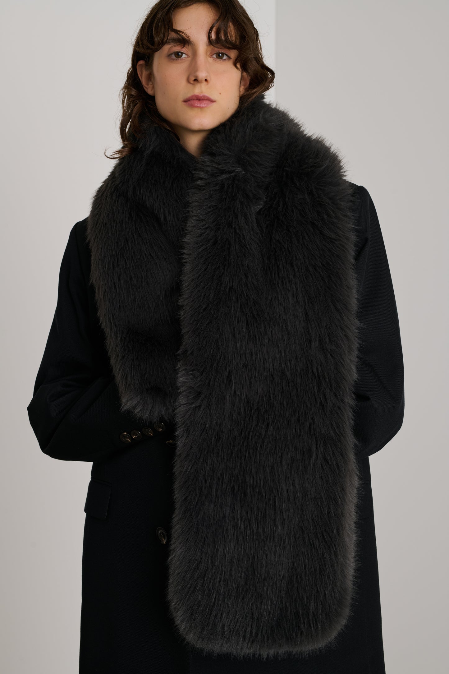 RUBY è una sciarpa in pelliccia sintetica. Di colore antracite scuro, con una pelliccia voluminosa, questo collo può essere indossato sopra un blazer o una camicia per riscaldare un outfit invernale.