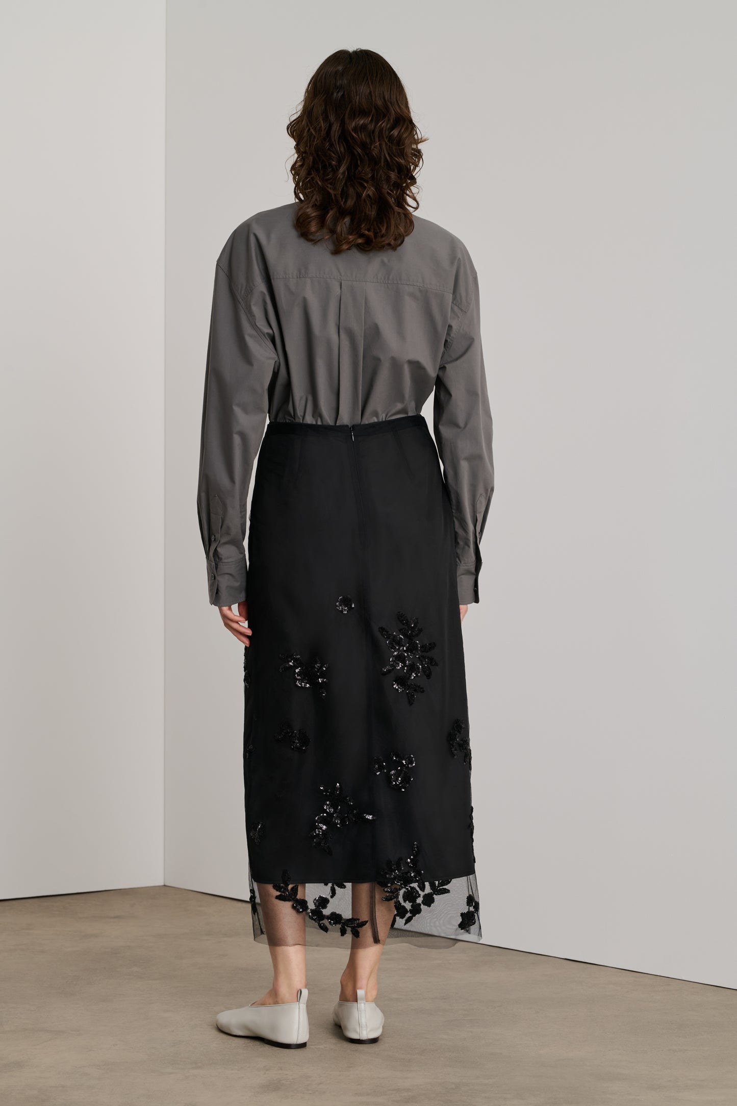 GRACE è un'elegante gonna lunga in tulle e ricami applicati. Realizzata in due parti: una sottogonna foderata per limitare le trasparenze e una gonna in tulle nero ricamata con elementi floreali in paillettes nere dal basso verso l'alto. Si chiude con due cerniere invisibili. Questa gonna versatile può essere indossata con o senza sottogonna, a seconda di quanto si voglia osare.