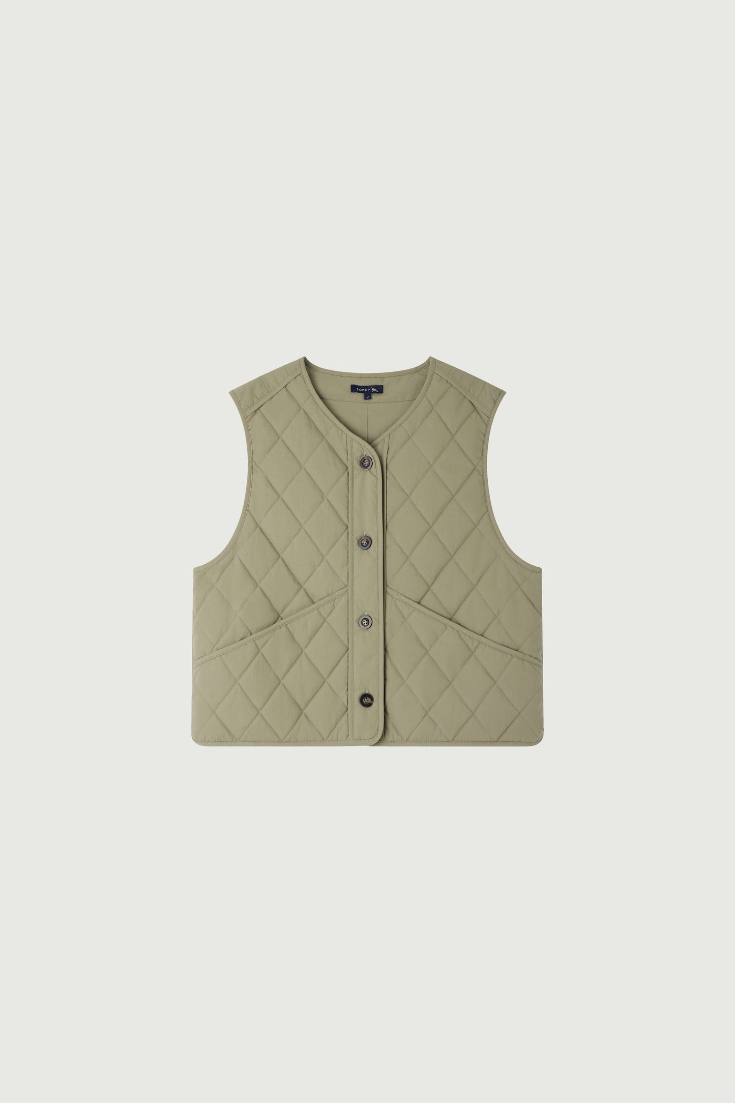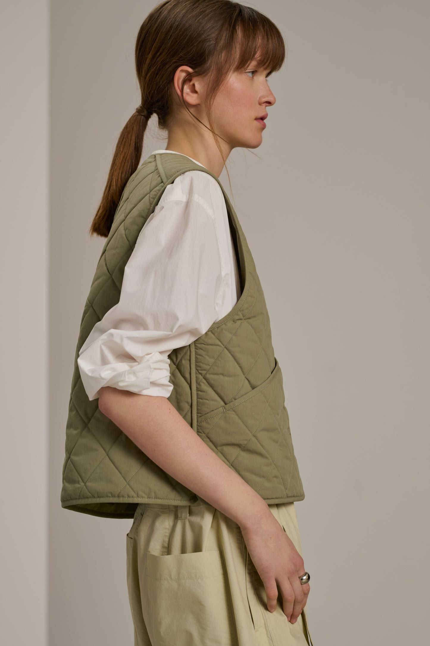 ULLA est un gilet matelassé en coton que l'on peut superposer à volonté. Il est légèrement rembourré mais suffisamment fin pour être porté sous un manteau sans contraindre le mouvement. Les finitions gansées soulignent les épaules, les poches plaquées, et la patte de boutonnage.