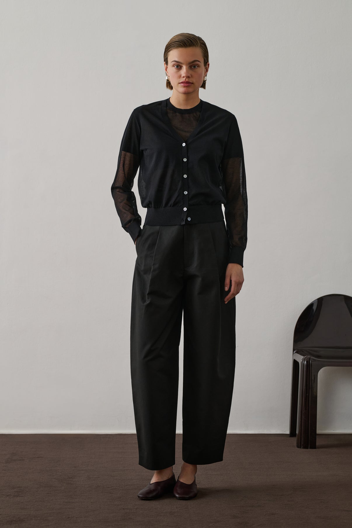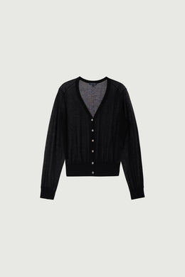 ETRETAT est un cardigan tricoté dans une maille ultra fine. Il se porte à même la peau ou en superposition pour jouer sur des effets de transparence. Versatile, il se veut habillé ou décontracté.