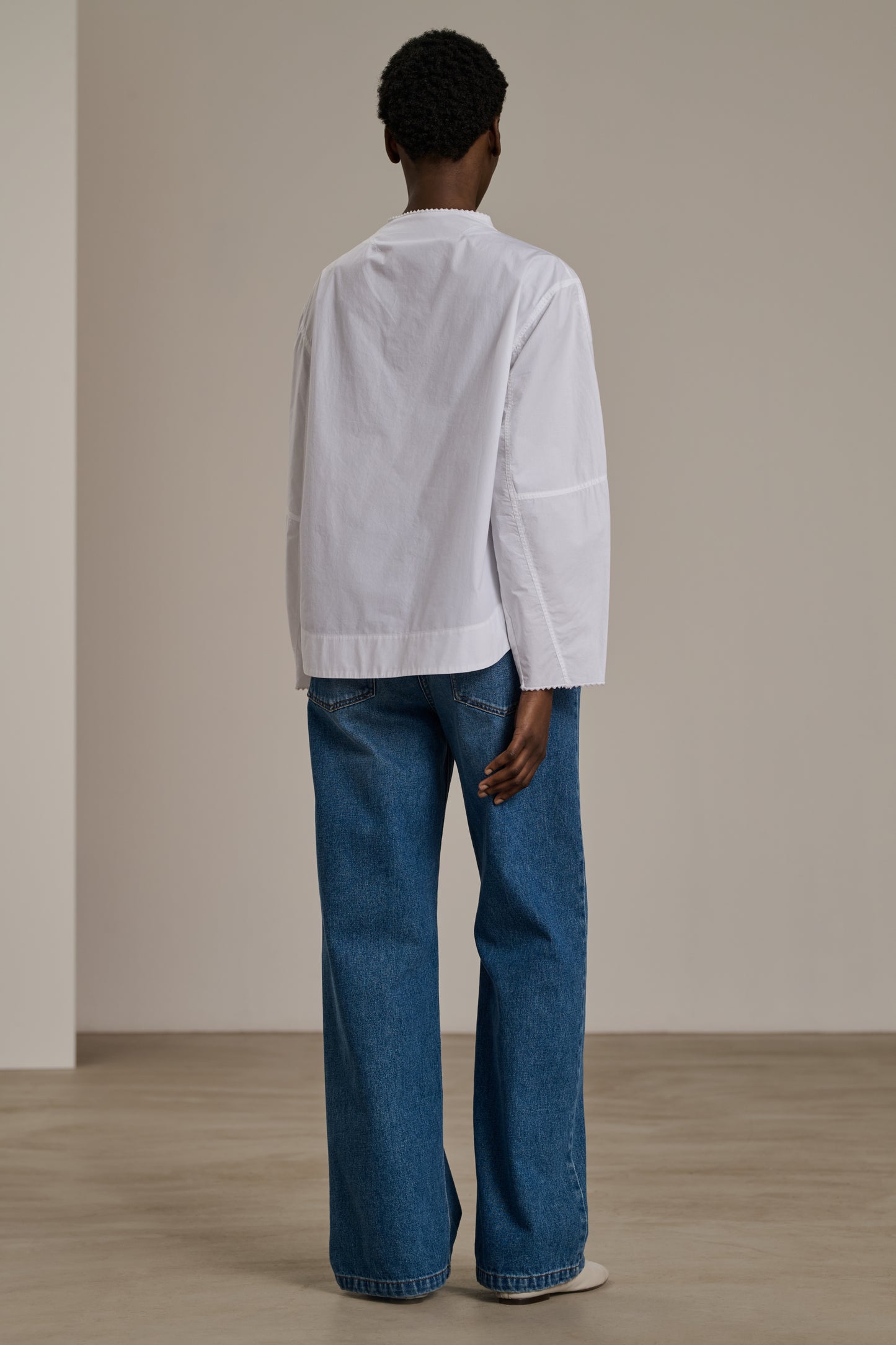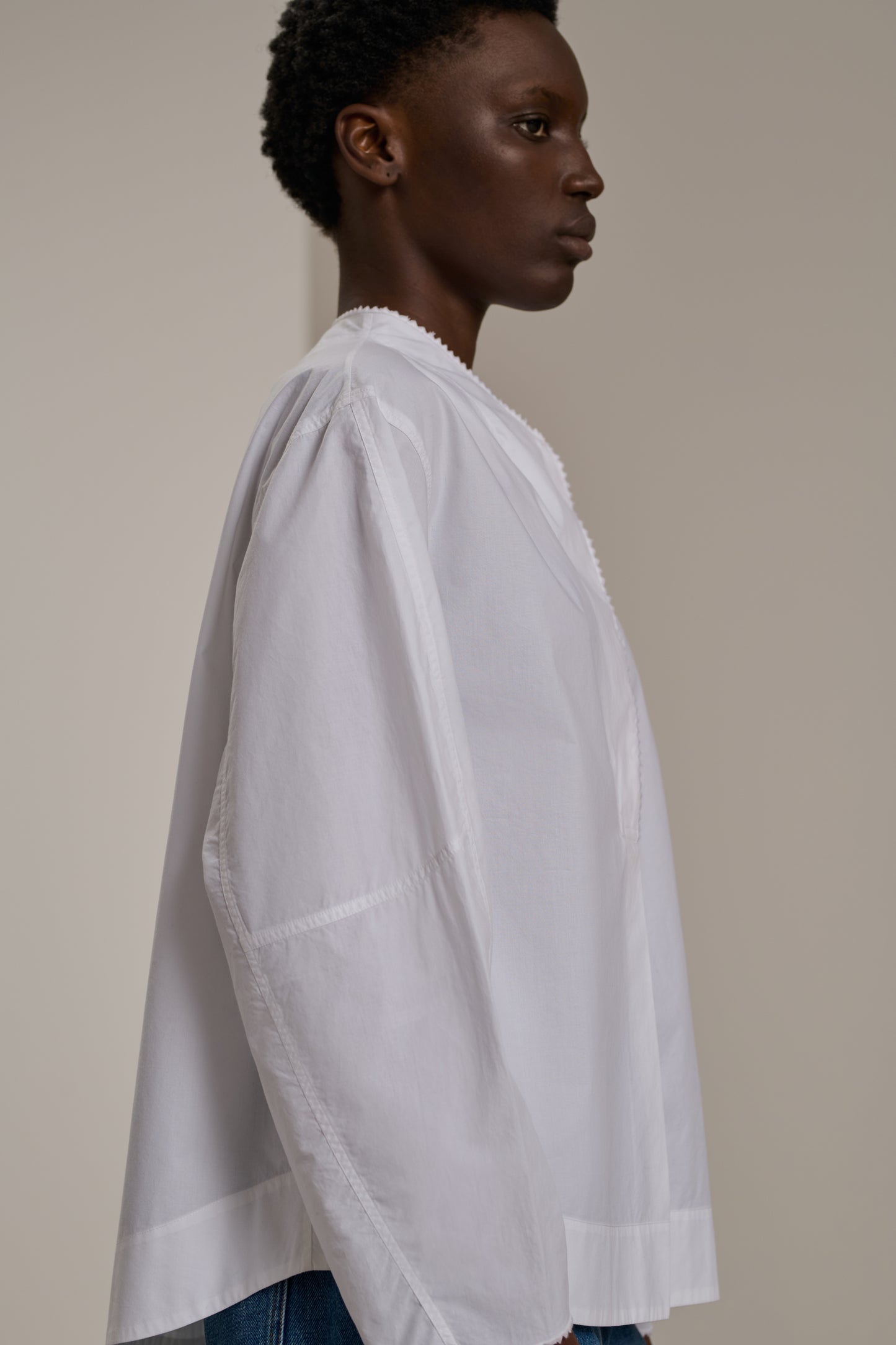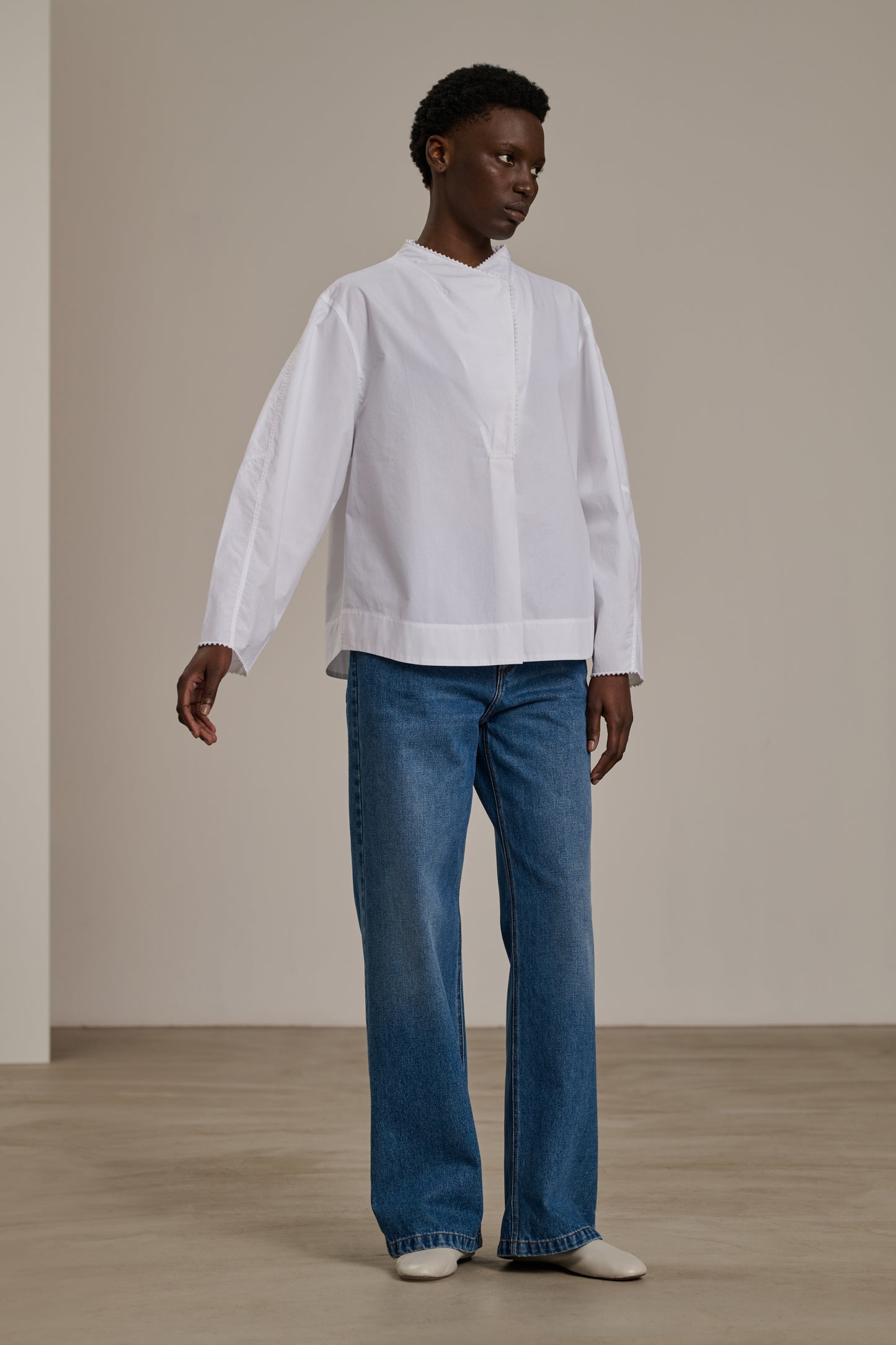 BERRY est une chemise en popeline de coton à coupe droite. Les manches longues et l'encolure se distinguent par un délicat détail de broderie, ajoutant une note de féminité subtile. Une chemise faussement classique qui se mariera bien dans votre garde robe.