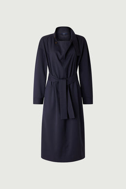 FANTASIA est une robe longue en gabardine légère navy, coupe droite et longueur mi-mollet. Son encolure à patte de boutonnage et sa ceinture amovible permettent de varier les styles. Le lainage fin et souple assure un tomber impeccable, tandis que les poches latérales ajoutent une touche d'élégance.